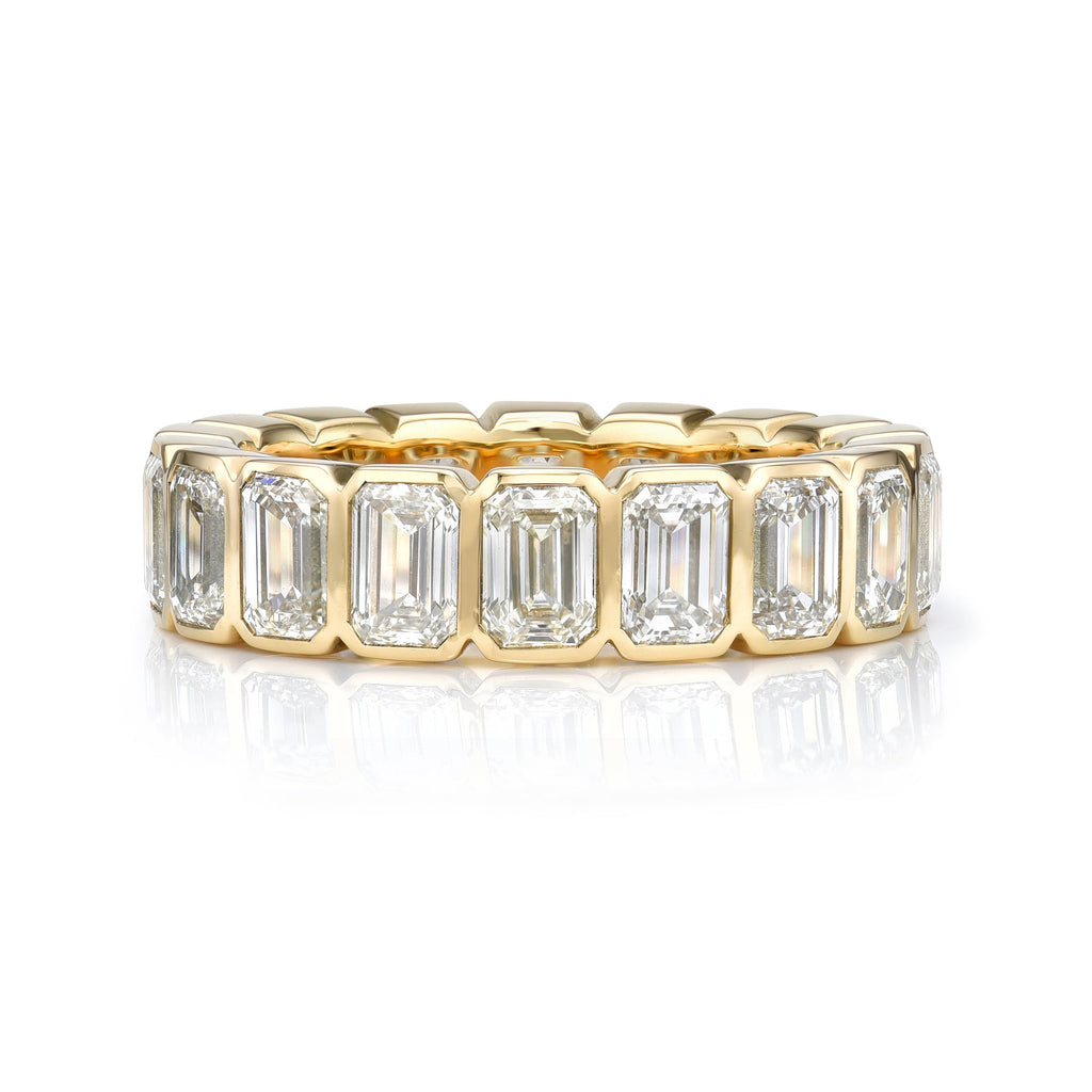 SINGLE STONE LARGE KARINA WITH GEMSTONES BAND | Approximately 2.75ctw-3.00ctw square French cut gemstones bezel set in a handcrafted 18K yellow gold eternity band. Available with rubies, sapphires or emeralds. Approximate band width 5.5mm. Please inquire